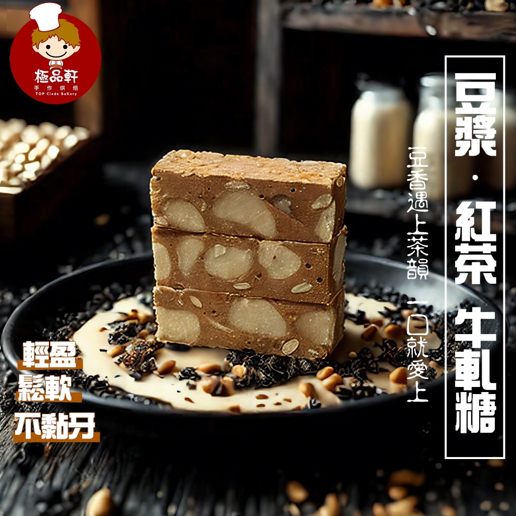 ●豆漿紅茶牛軋糖(麥芽、夏威夷豆、乳糖、南瓜子、豆漿粉、蛋白霜粉、奶油、紅茶粉、鹽、乾燥桂花)• 「豆香遇上茶韻,一口就愛上!」